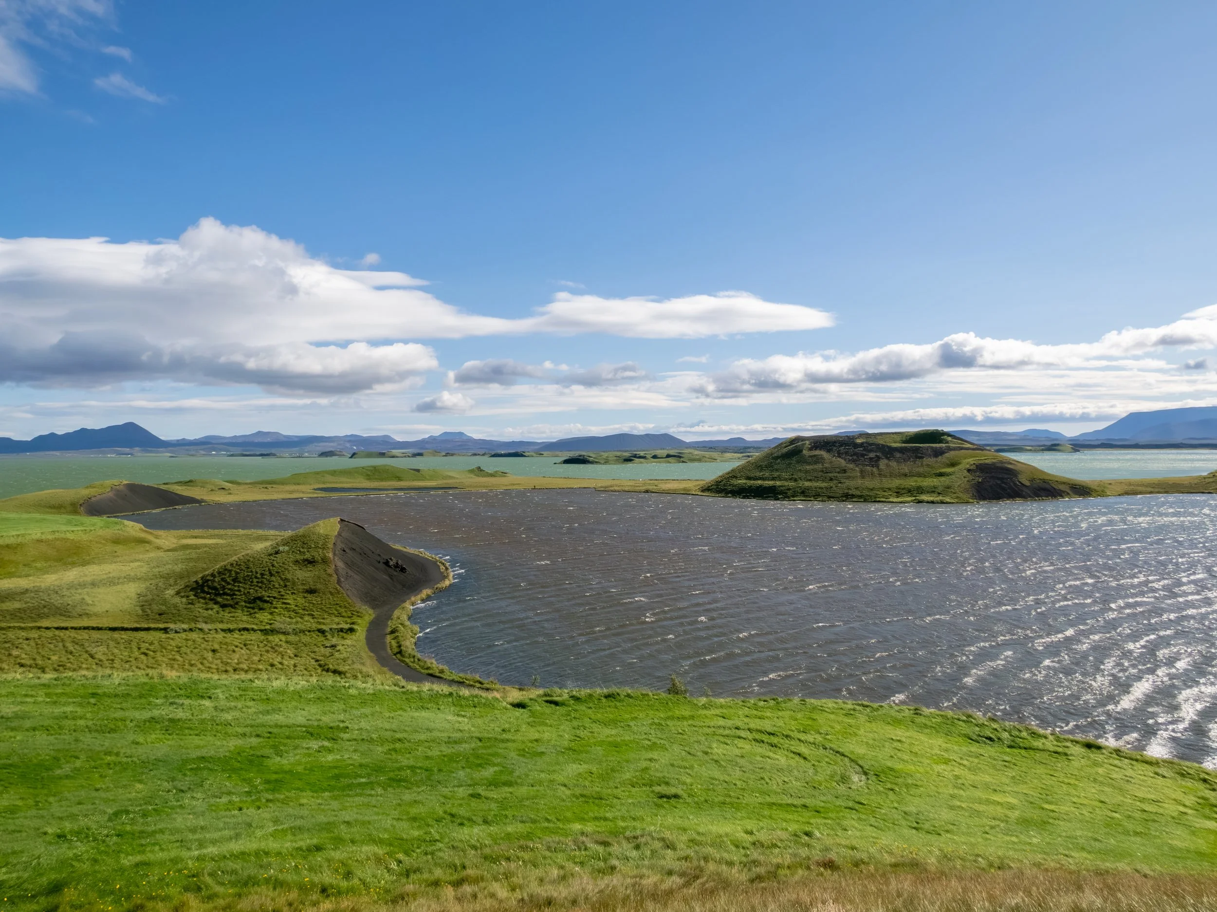 Der flache See Myvatn entstand vor etwa 2.300 Jahren durch einen Vulkanausbruch. Heute ist er von Lavafeldern und Pseudokratern umgeben.