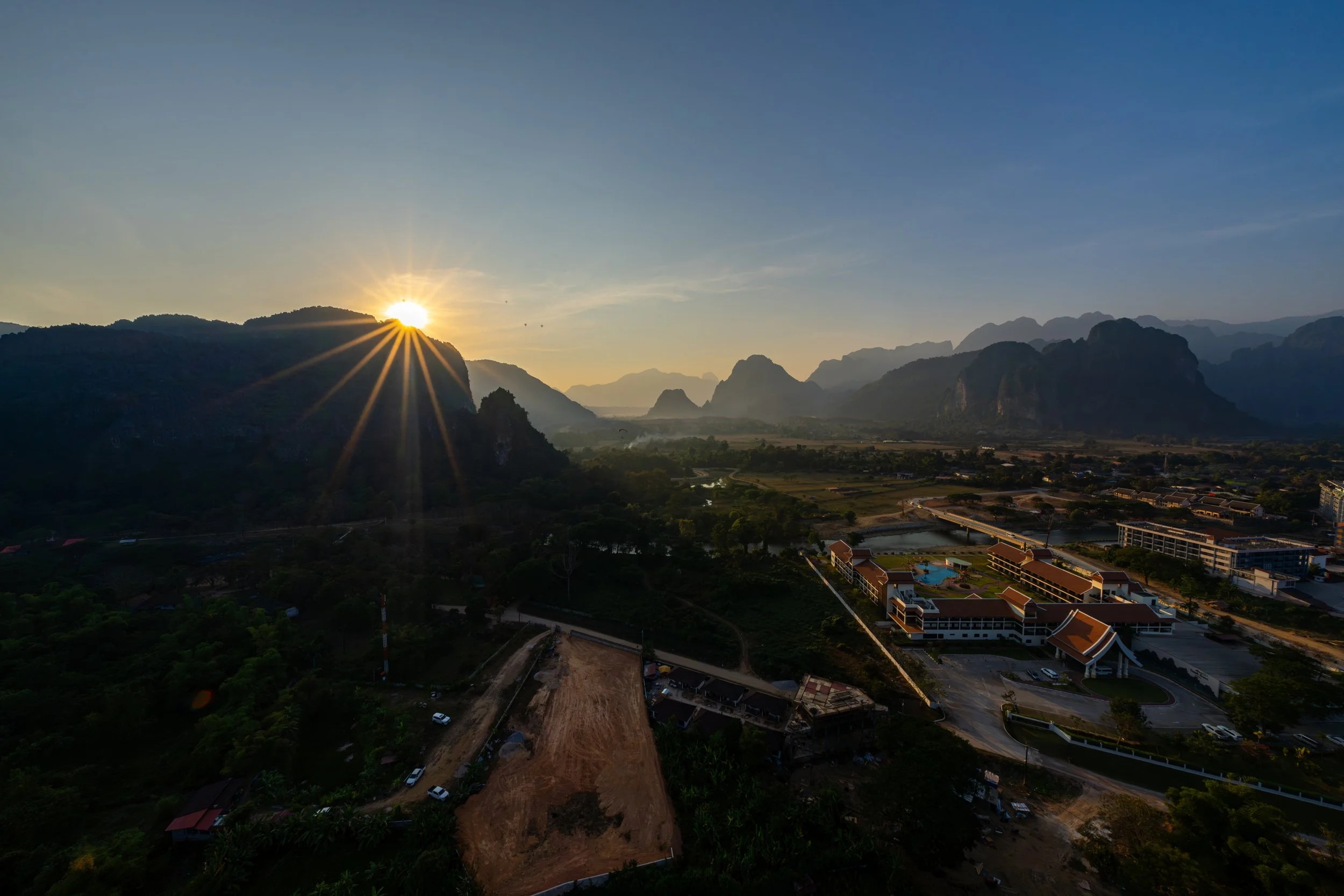Heißluftballons und Motorgleitschirme bieten in Vang Vieng eine besondere Perspektive auf die Karstlandschaft und zeigen die beeindruckende Weite der Region aus der Luft. Besonders in den frühen Morgen- oder Abendstunden prägen sie das Panorama über Bergen und Reisfeldern.