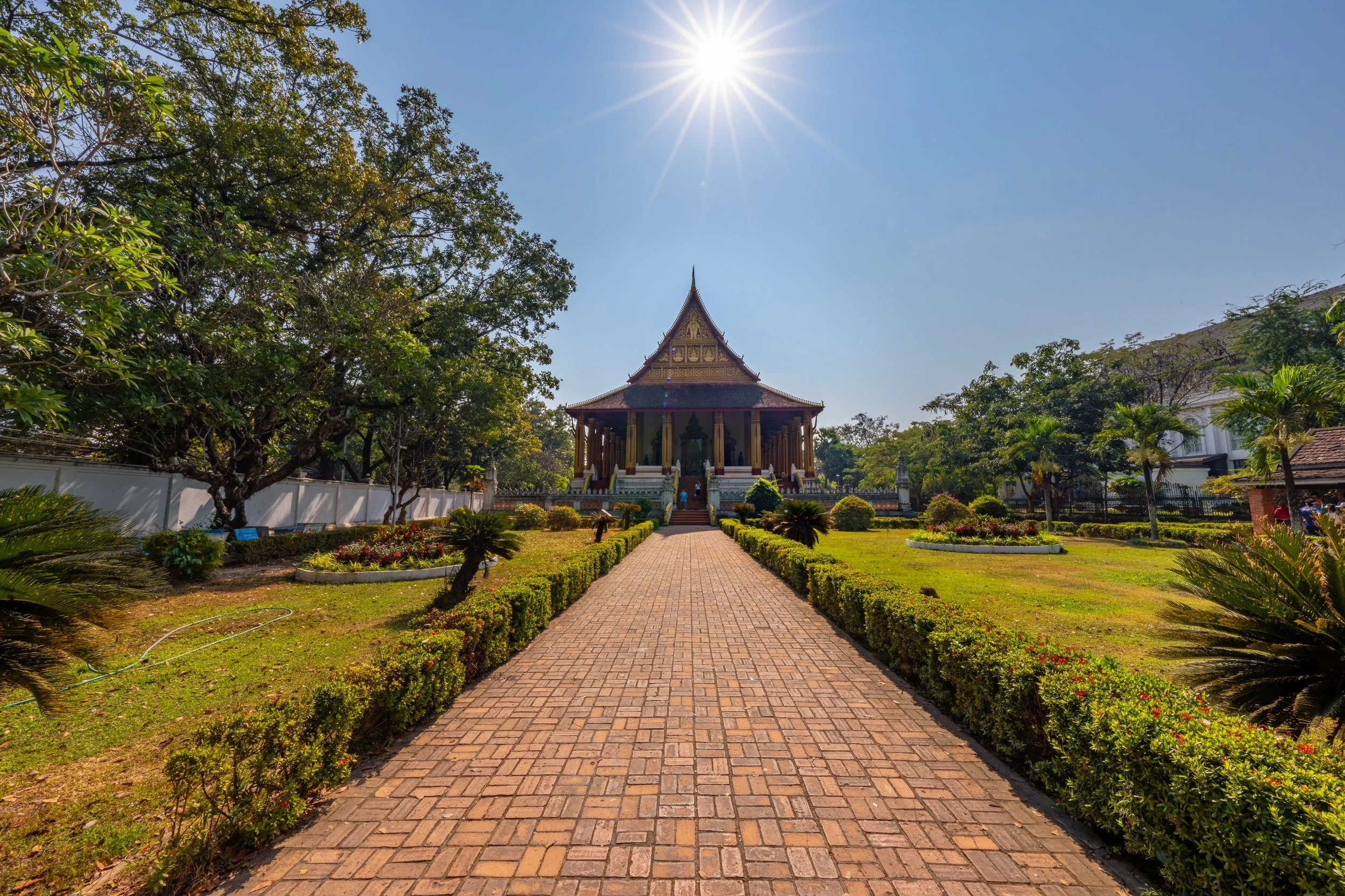 Die ruhige Anlage mit ihren kunstvoll verzierten Säulen und gepflegten Gärten spiegelt den klassischen Stil laotischer Tempelarchitektur wider.